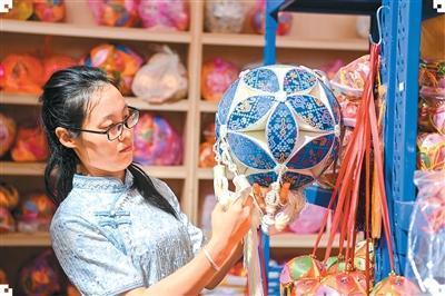 在广西靖西的一家绣球生产企业,总工艺师王秀芬在检查绣球成品的质量。新华社记者 曹祎铭摄