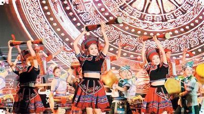 在广西河池举办的第二十三届河池铜鼓山歌艺术节开幕式上,演员在表演舞蹈《鼓韵千年》。高东风摄(人民图片)