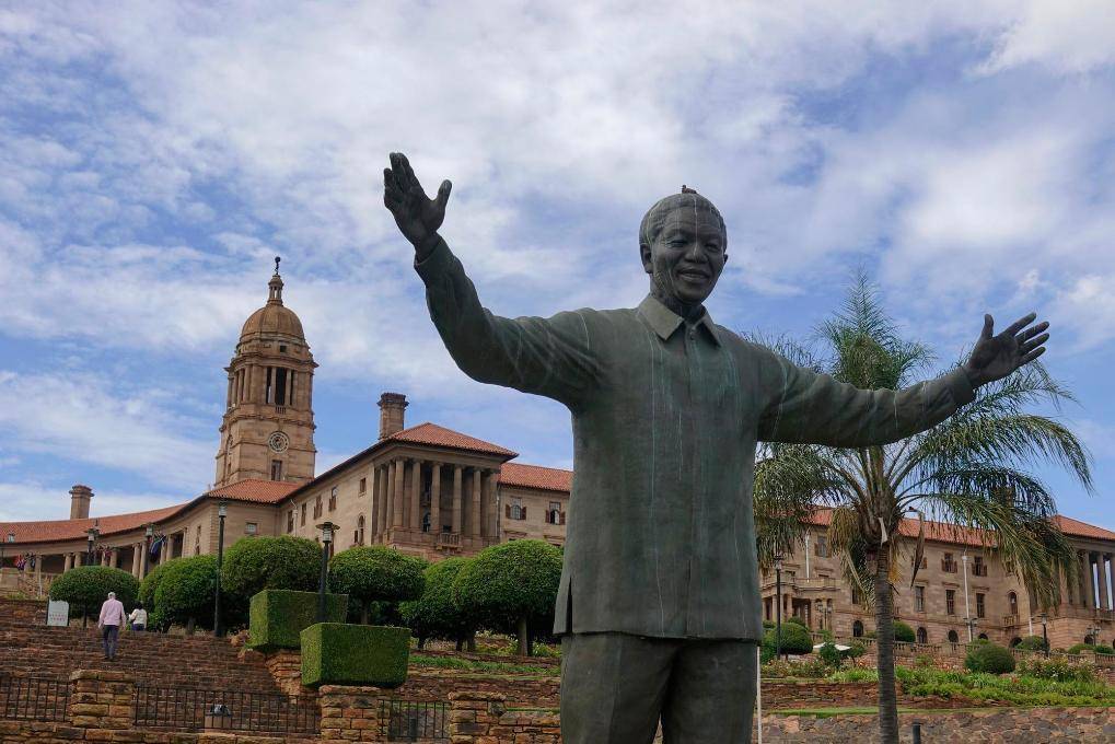 这是2月18日在南非行政首都比勒陀利亚拍摄的联邦大厦广场上的纳尔逊·曼德拉雕像。新华社记者陈为摄