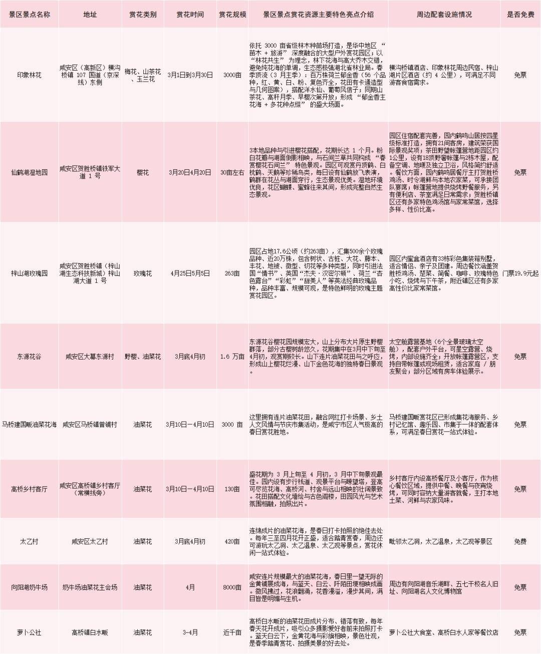 咸安区赏花游景区景点一览表(点击图片放大查看)