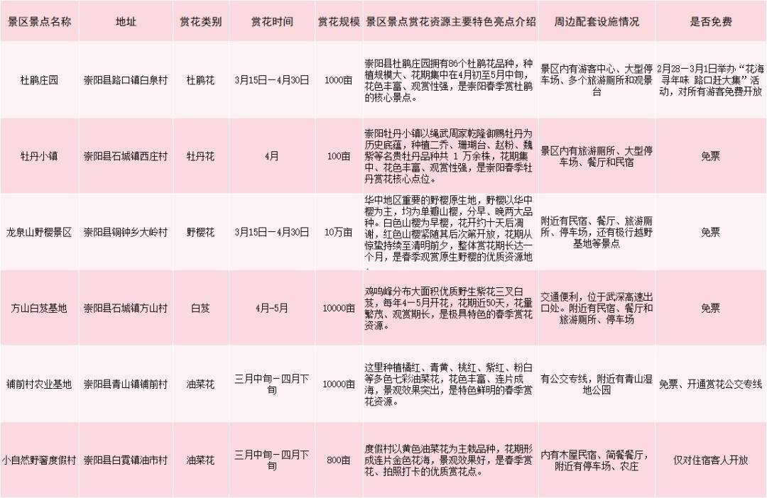 崇阳县赏花游景区景点一览表(点击图片放大查看)