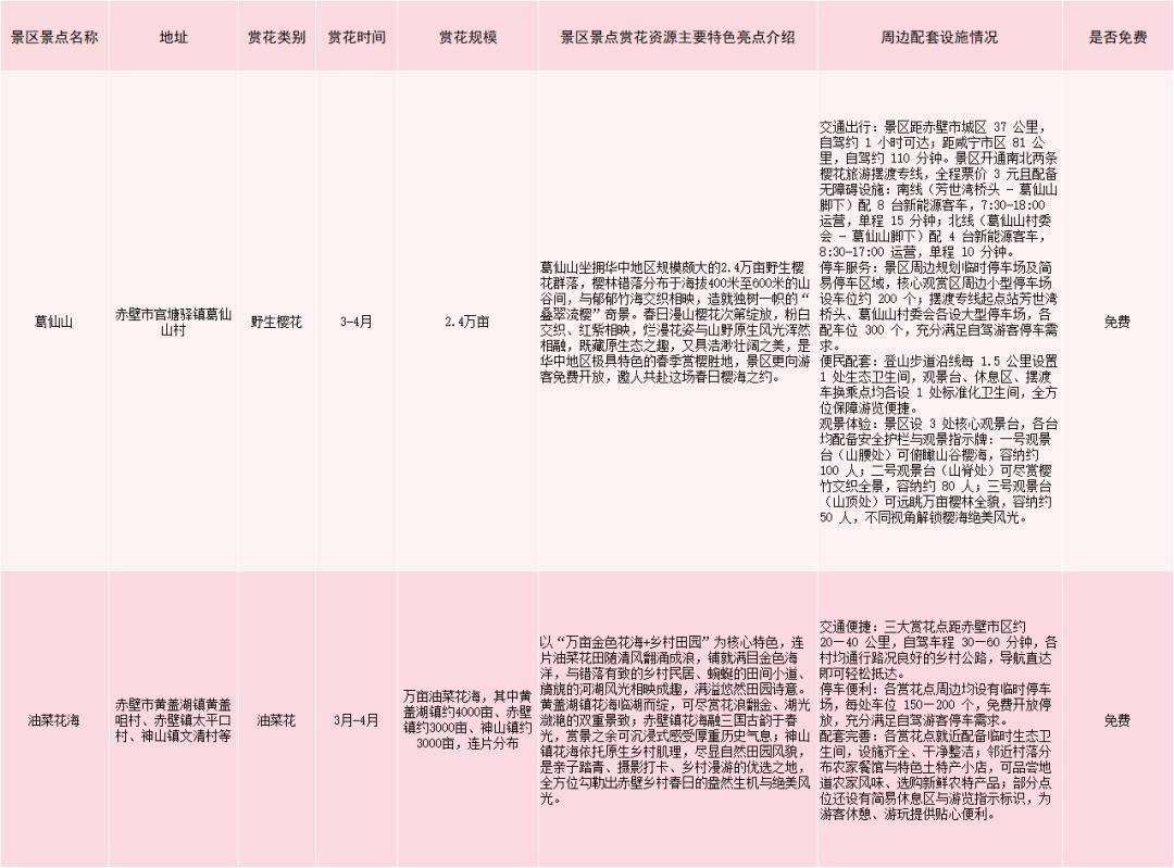 赤壁市赏花游景区景点一览表(点击图片放大查看)
