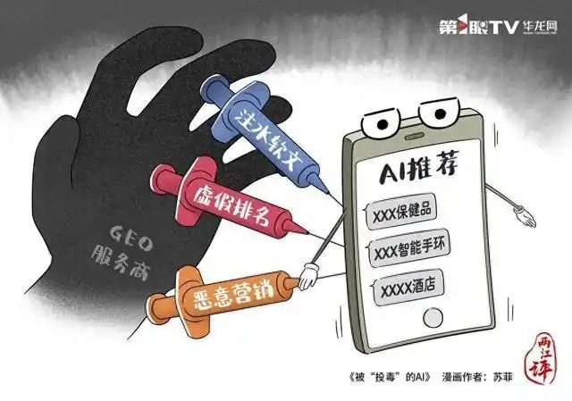 此类现象的危害不容忽视。GEO服务商用不实信息干扰算法推荐,将商业推广伪装成AI生成的参考而隐瞒广告属性,这不仅侵犯消费者知情权,还可能误导消费者的购买决策、损害其合法权益,也会对合法合规经营的市场主体造成冲击,破坏公平竞争的市场环境。同样值得警惕的是,如果AI的输出内容可以被人为操控、肆意伪造,公众对AI生成内容的信任感,将受到侵蚀。而“算法污染”一旦加剧,智能工具或将制造更多的“谎言”甚至数字垃圾。
