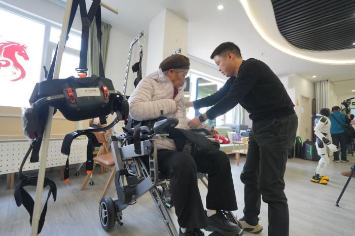 老人在体验机器轮椅。