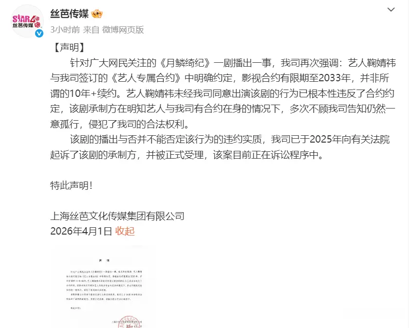 4月1日,也就是《月鳞绮纪》开播当日,丝芭传媒又跳了出来。针对《月鳞绮纪》播出一事,公司再次强调:艺人鞠婧祎与我司签订的《艺人专属合约》中明确约定,影视合约有限期至2033年,并非所谓的10年+续约。